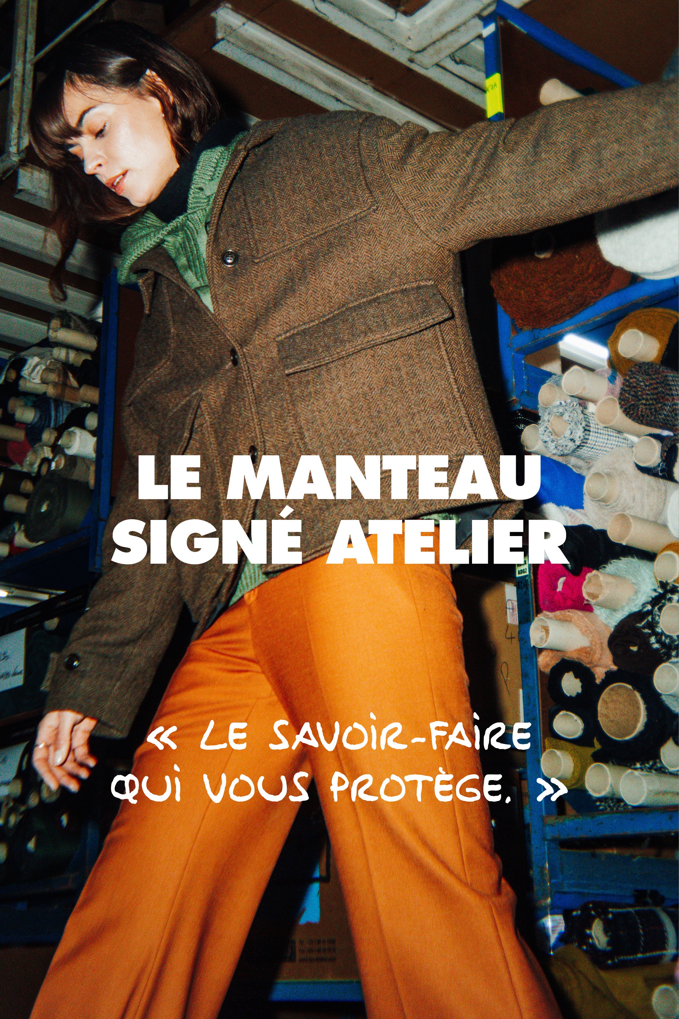 Rouille, terracotta, camel, brique, kaki… autant de nuances qui réchauffent le teint et réveillent les silhouettes. Chaque manteau est pensé comme une pièce forte, confectionnée dans des laines italiennes, des bouclettes texturées ou des matières déperlantes adaptées aux intempéries.
